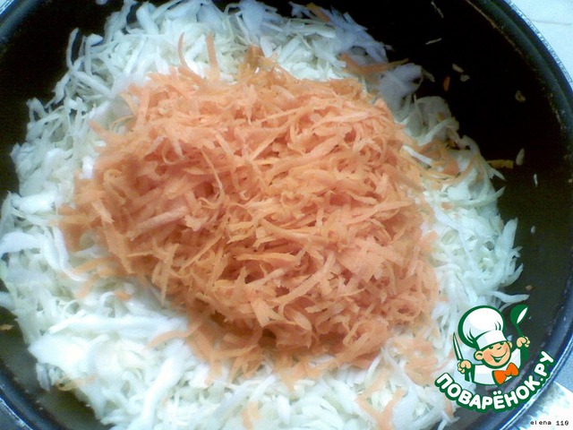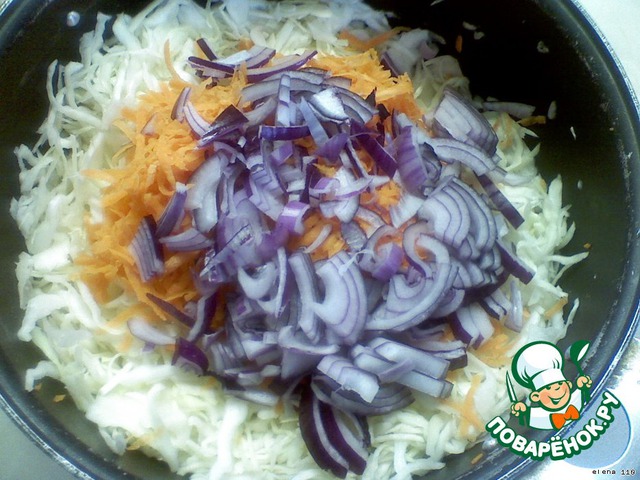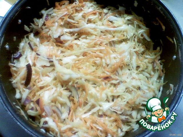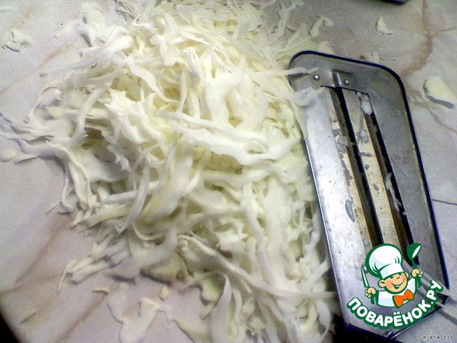 Капусту нарезать соломкой, положить в кастрюлю, добавить соль и перетереть руками (чтобы начался выделяться сок).