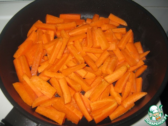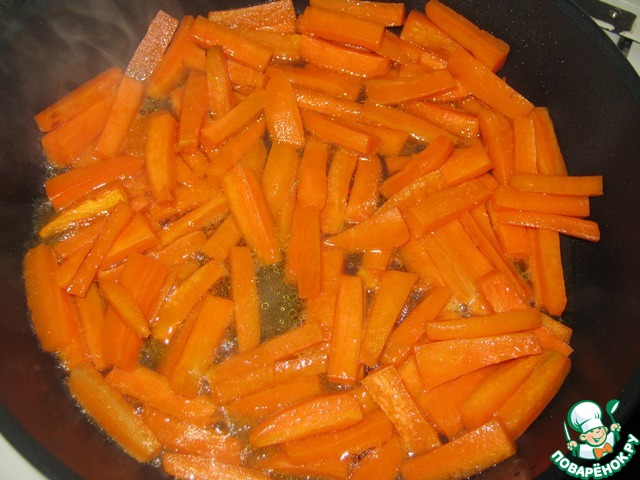 Морковь нарезать брусочками по 4-5 см длиной. Обжарить на растительном масле на среднем огне минут пять.