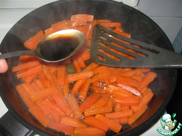 Добавить к моркови мед и соевый соус Kikkoman, перемешать и готовить ещё 10 минут.