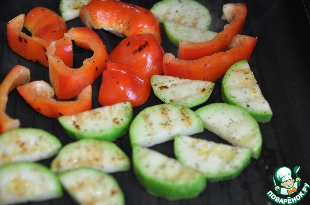 Кладём овощи на сковороду гриль и обжариваем с обоих сторон по 1 минуте.
