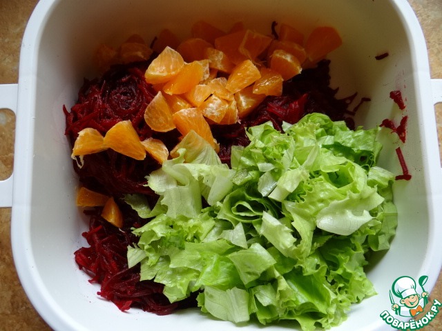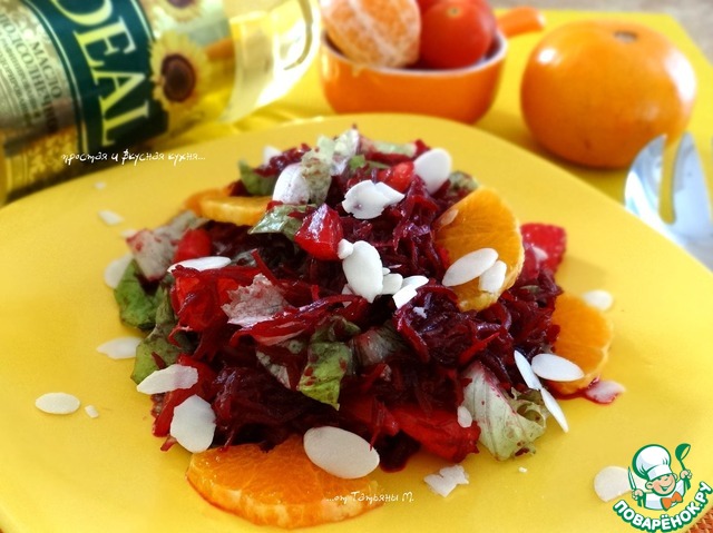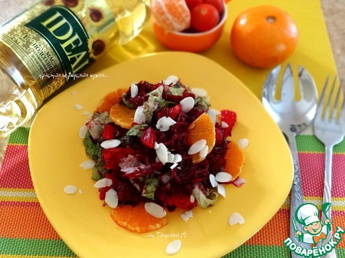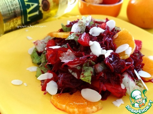 | Вкусный, полезный и красивый салатик - очень нежно сочетает в себе вкус мандарина со свеклой и кисло-сладкой заправкой! |