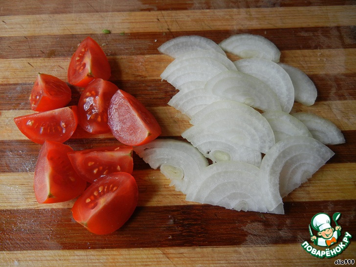 Помидорки черри нарезаем четвертинками, лук очищаем и нарезаем полукольцами.