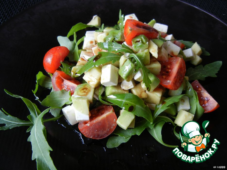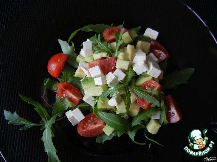 Приготовим заправку. В небольшой мисочке смешиваем оливковое масло, соевый соус, уксус, соль и черный молотый перец. Рукколу промываем, обсушиваем и выкладываем на тарелку, сверху выкладываем лук, затем авокадо, фету и помидорки. Перед подачей полить заправкой.