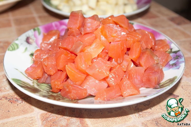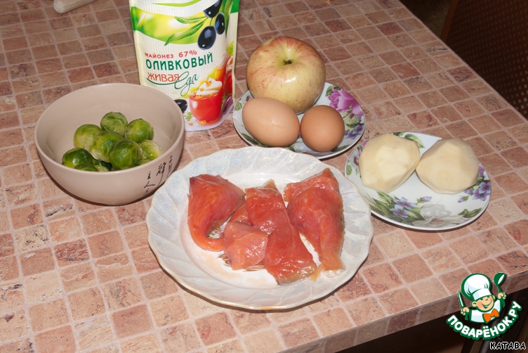 Вот такой нехитрый набор для нашего салата. Рыба у меня была форель и семга кусочками в вакууме с маслом, чуть подкопченные. Для салата отлично подошло. Картофель и яйца сварить. Я расcчитывала на 2 порции.