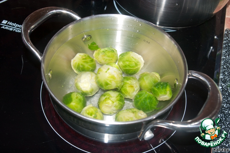 Брюссельскую капусту отварить в подсоленной воде минут 15-20.