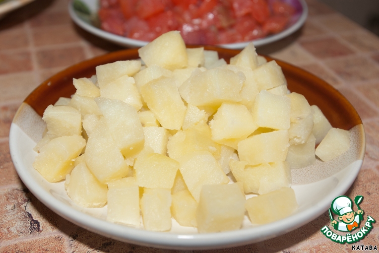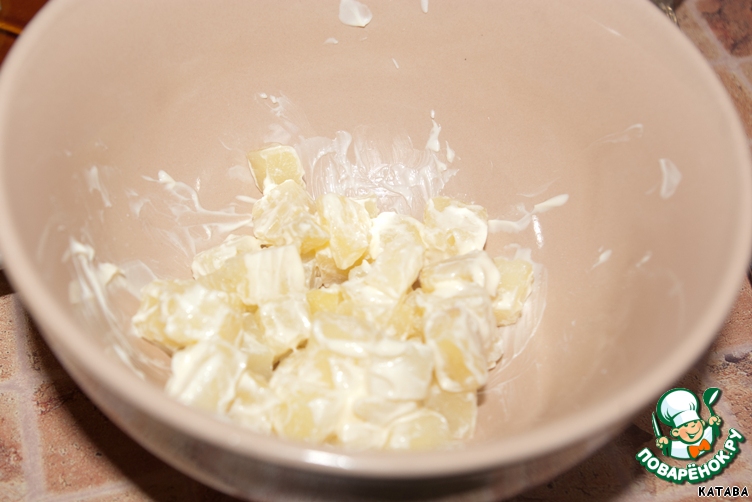 Первый (нижний слой) - картофель. Его "обваливаем" немного в майонезе и выкладываем. Смотрите, чтобы майонеза было совсем чуть-чуть. Чтобы ничего в нем не плавало, конечно.