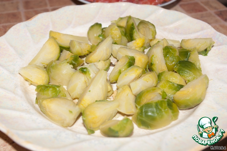 Брюссельскую капусту вынуть шумовкой, дать остыть, порезать каждый шарик на 4 части.