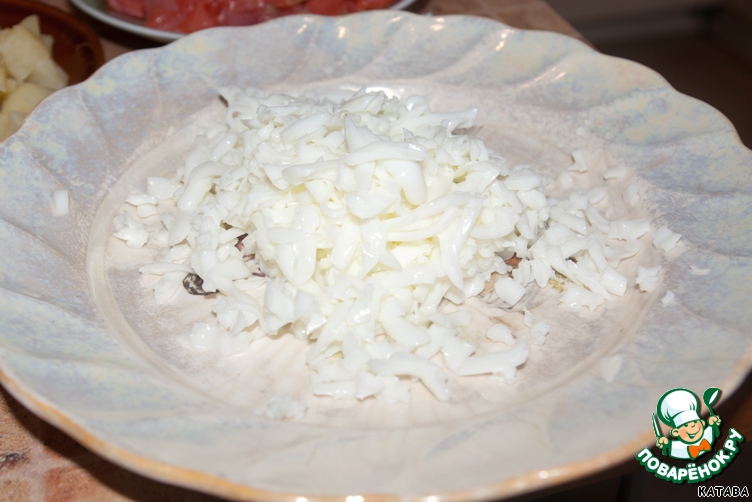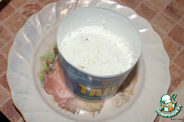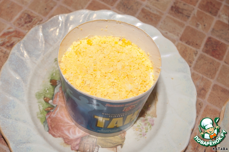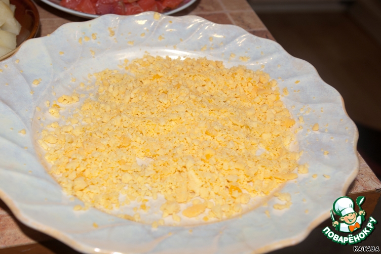 Вареные яйца разделить на белки и желтки. Белки протереть на средней терке.