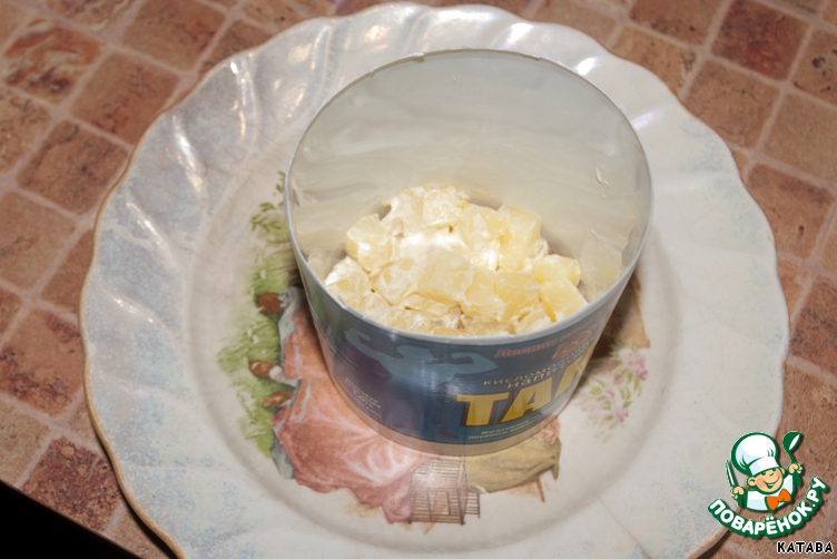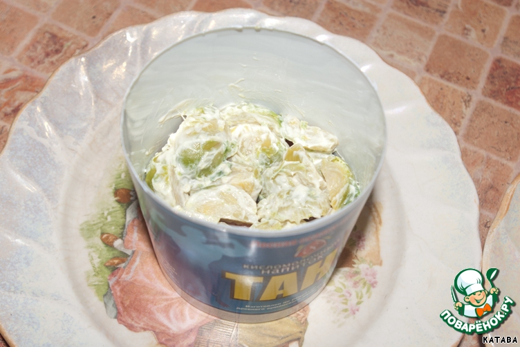 Салат на картинке был в виде башенки. Специального девайса у меня нет, поэтому я, не долго думая, разрезала пластиковую бутылку (отрезала дно и горлышко, оставив только серединку), чтобы получилась такая вот "трубочка". Первый слой - картофель с майонезом.