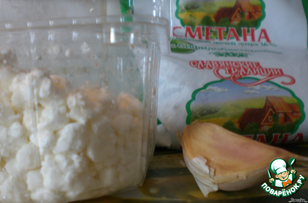 В творог чесночницей выдавливаем чеснок, добавляем сметану, щепотку соли и перемешиваем. Оставляем настаиваться.