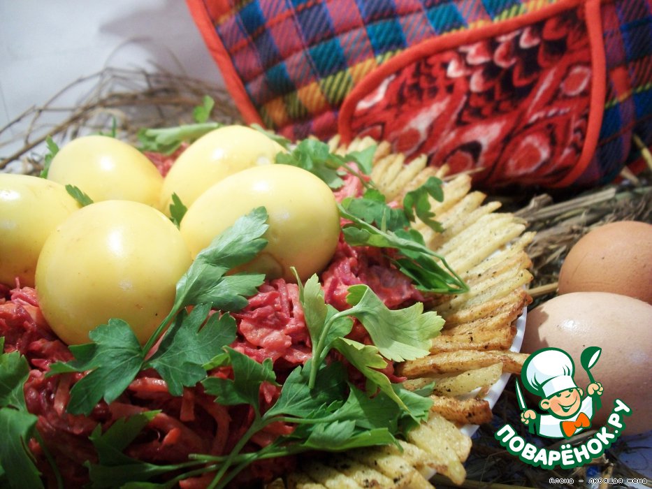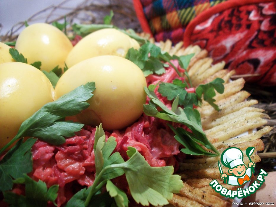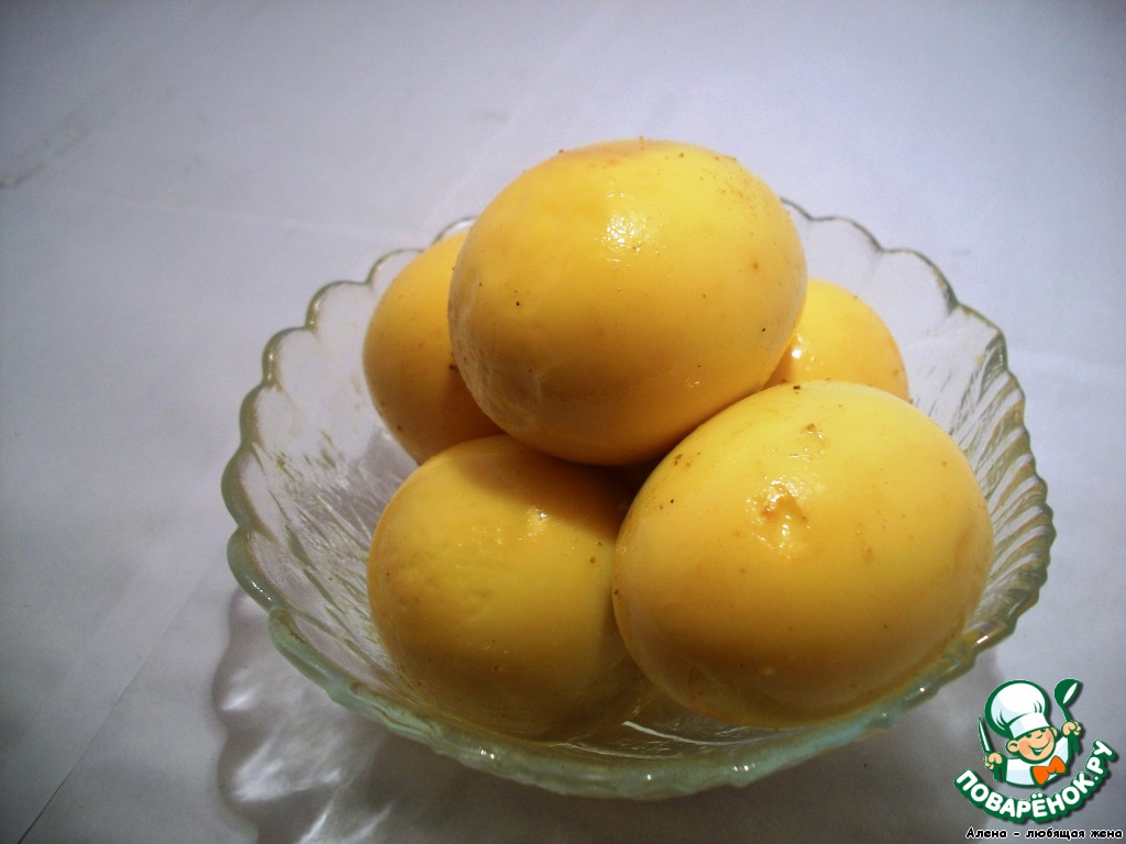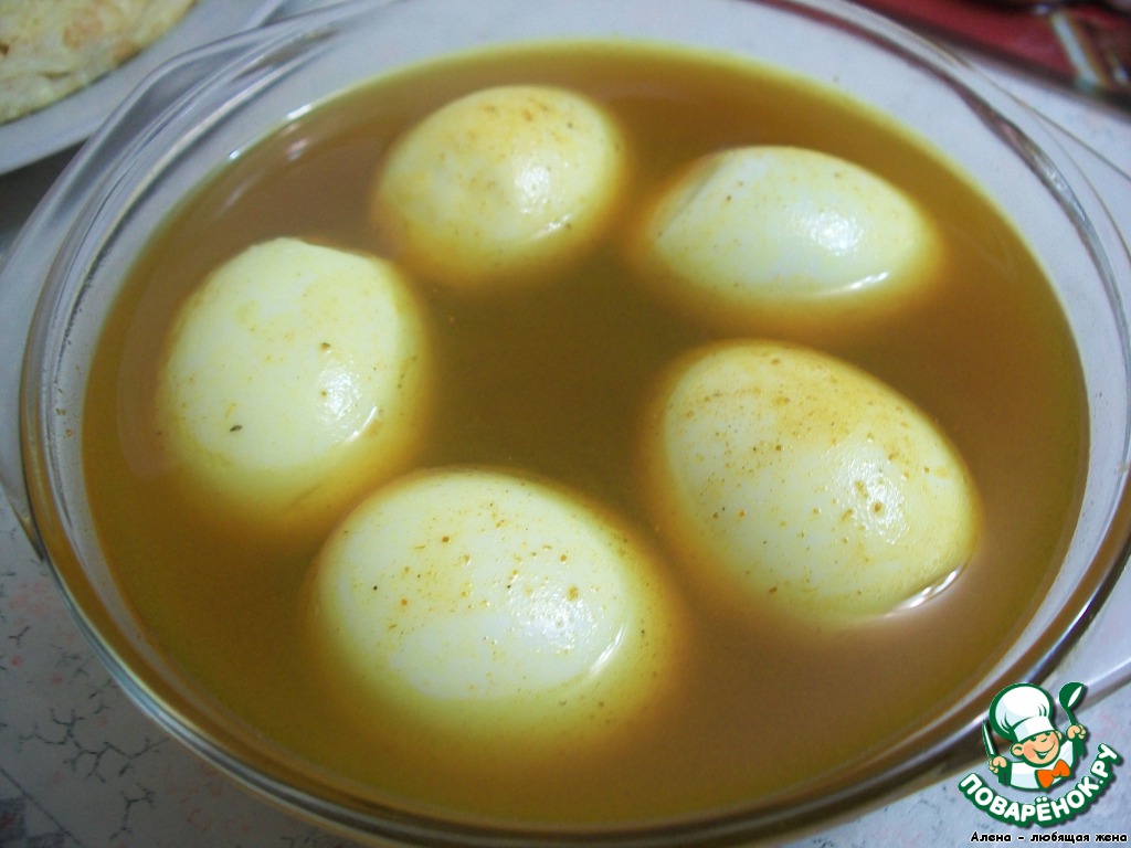 Для этого салата нам понадобятся золотые яйца, приготовим их заранее: для этого отвариваем куриные яйца, чистим и заливаем растительным маслом, смешанным с приправой карри, чтобы их покрыло. Оставляем в холодильнике хотя бы на сутки, я держала 3 дня