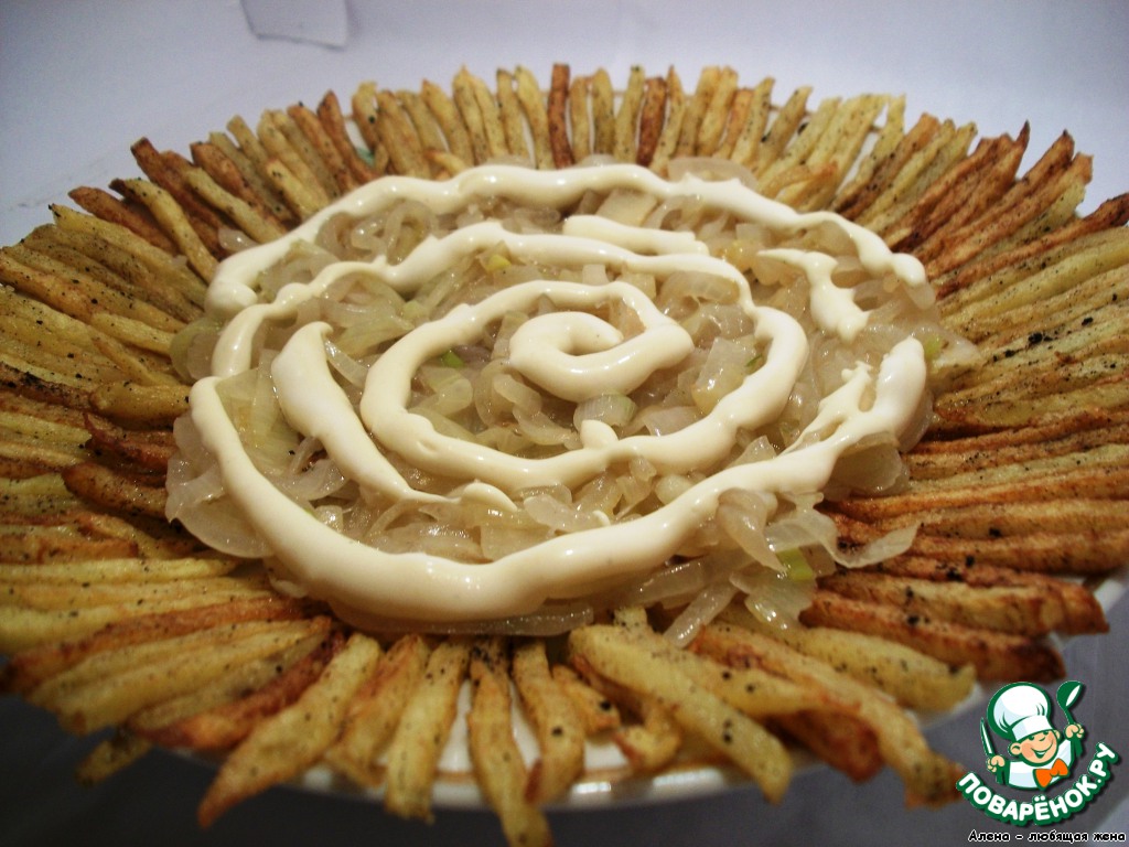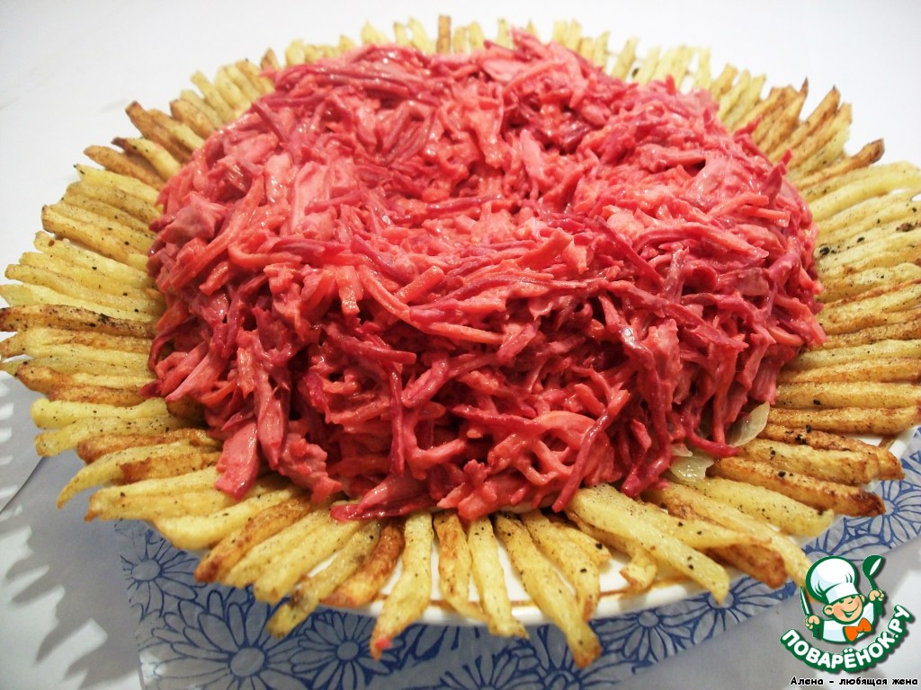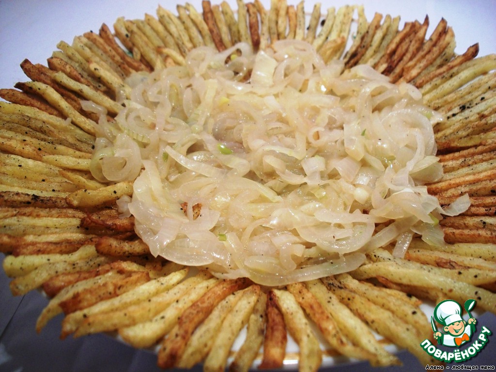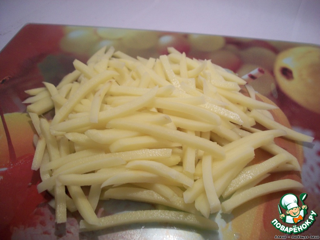 Картофель нарезать длинной соломкой и обжарить в большом количестве растительного масла