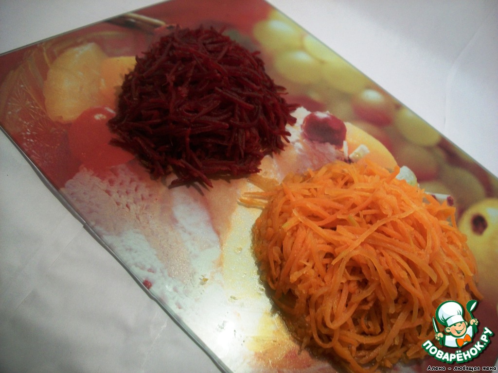 Свеклу и морковь натереть на терке для моркови по-корейски