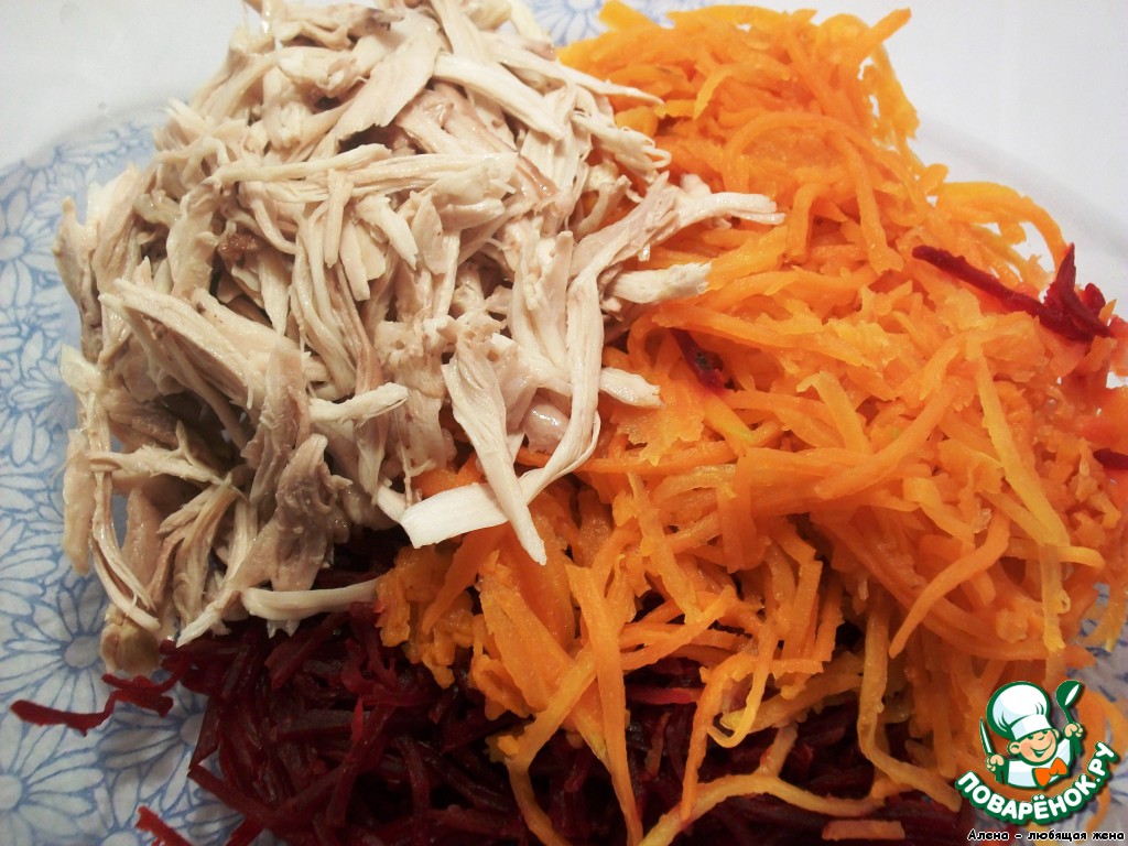 Свеклу, морковь и курицу немного посолить и смешать с оставшейся смесью майонеза и горчицы