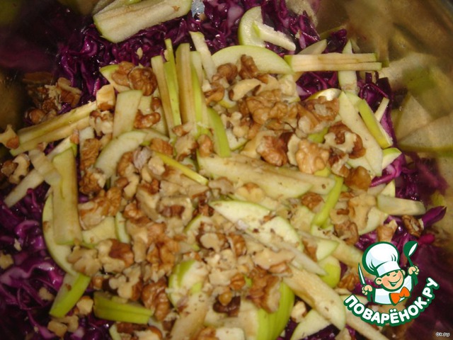 Добавить к капусте яблоки, измельченные грецкие орехи.