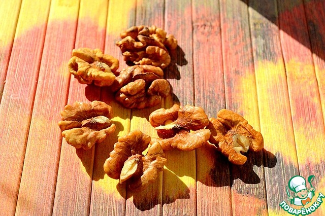 Измельчаем грецкие орехи. Я это делаю с помощью скалки - складываю орехи в кухонное полотенце и прокатываю по ним скалкой.