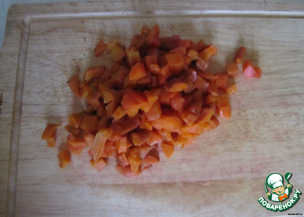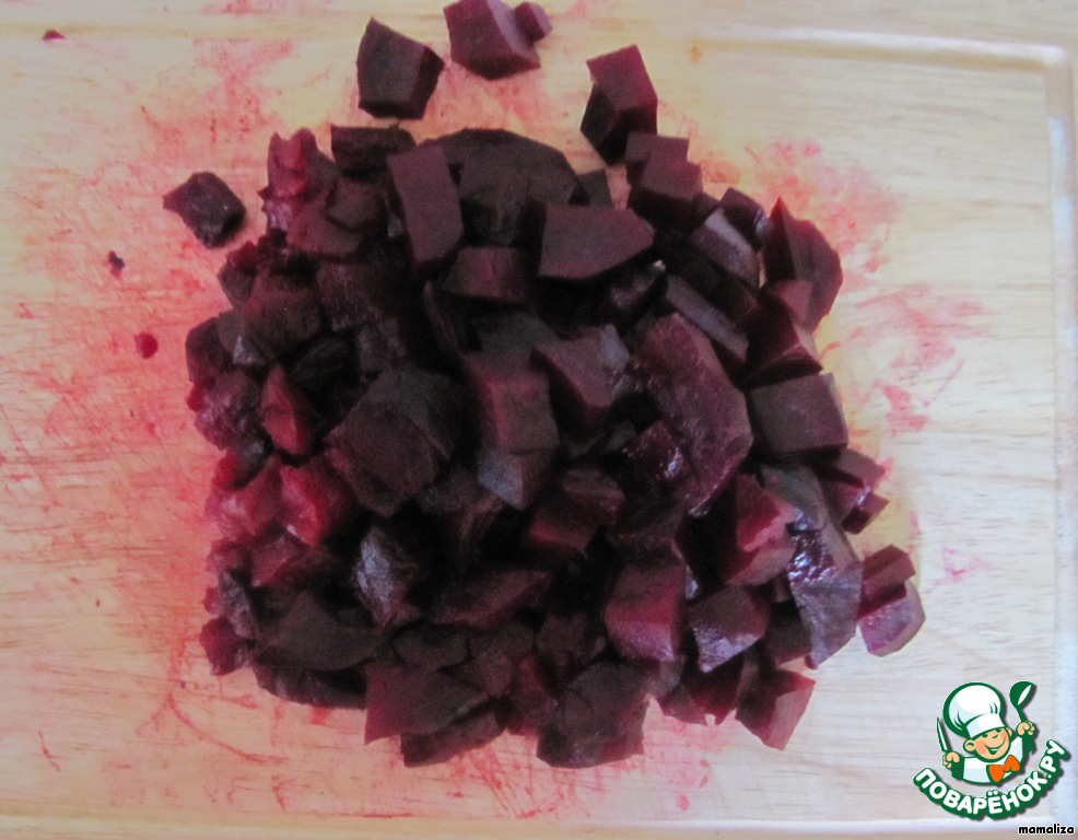 Овощи отварить. Но будет гораздо вкуснее, красивее и полезнее, если их запечь в духовке в фольге или в соли. Готовые овощи охладить в холодной воде, почистить. Свеклу нашинковать кубиками.