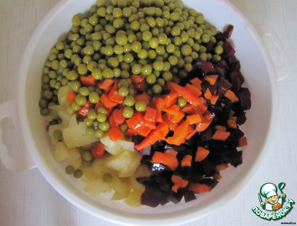 Соединить все ингредиенты для винегрета, посолить, заправить оливковым маслом.