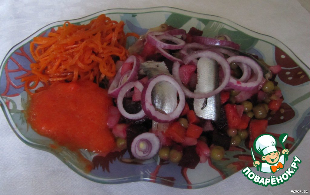 Приготовить соус. Для этого перец запечь до корочки, освободить от кожуры, взбить блендером с добавлением соли, сахара и уксуса. Винегрет украсить кольцами красного лука и филе кильки. Подавать винегрет с корейской морковью и соусом.