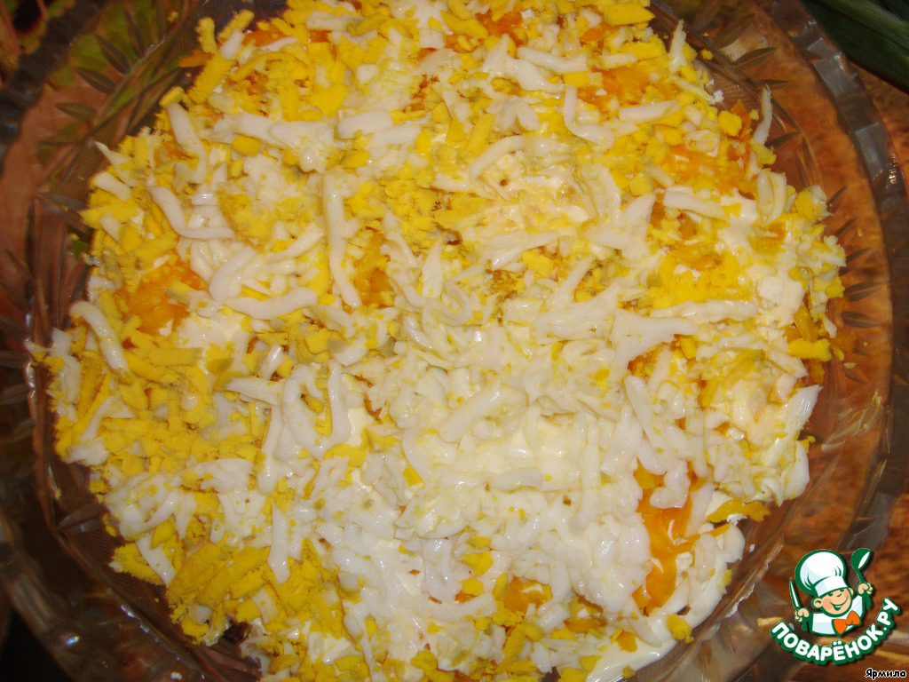 Следующим слоем трем вареную морковь, потом яйца и между слоями добавляем майонез.