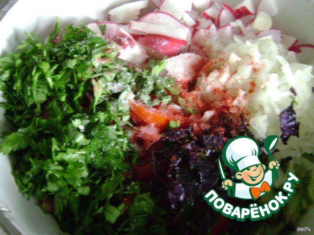 Луковицу мелко нарезать, промыть в горячей воде, чтобы ушла горечь.Добавить к овощам. Нарезать мелко зелень (любую).Обычно я использую петрушку, кинзу(или кориандр), укроп и немного базилика.Туда же добавить мелко нарезанный чеснок.Соль по вкусу(обычно кладу 1-1,5 ч.л.),перец красный, черный(по 0,5 ч.л.),уксус(3 капли), растительное масло.