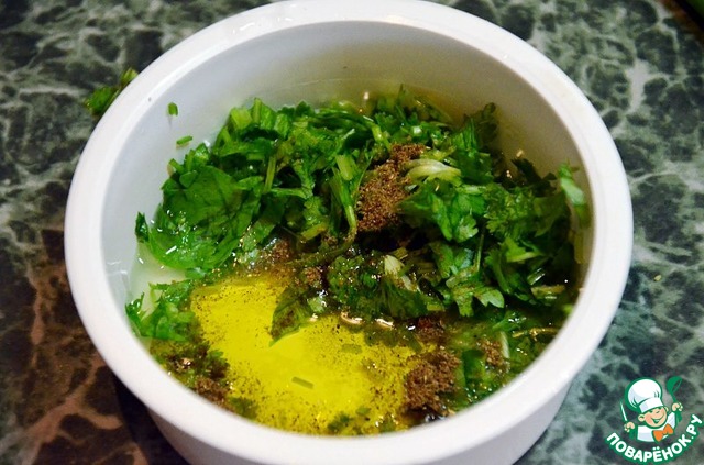 Сделать заправку: мелко порубить зелень, смешать с соком лайма и оливковым маслом. Измельчить зерна кориандра, добавить их к основной смеси, посолить и поперчить. Оставить на 15 минут.