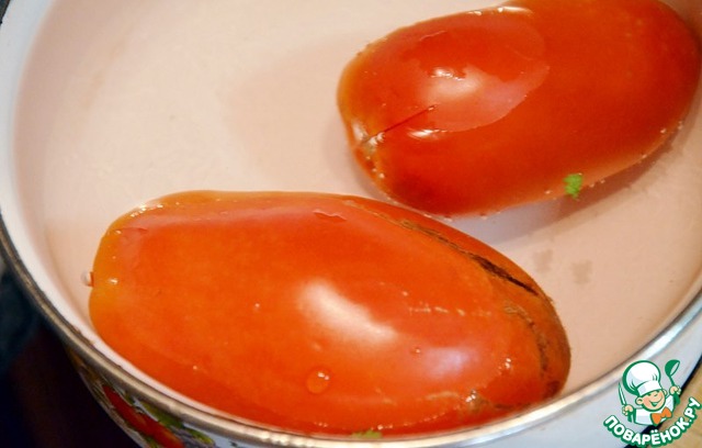 Кожицу помидоров надрезать крест-накрест, опустить в кипяток на 30 секунд и сразу же опустить в холодную воду.