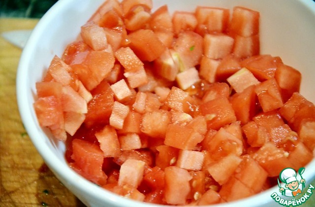Снять кожицу, удалить семена, мякоть нарезать мелкими кубиками.