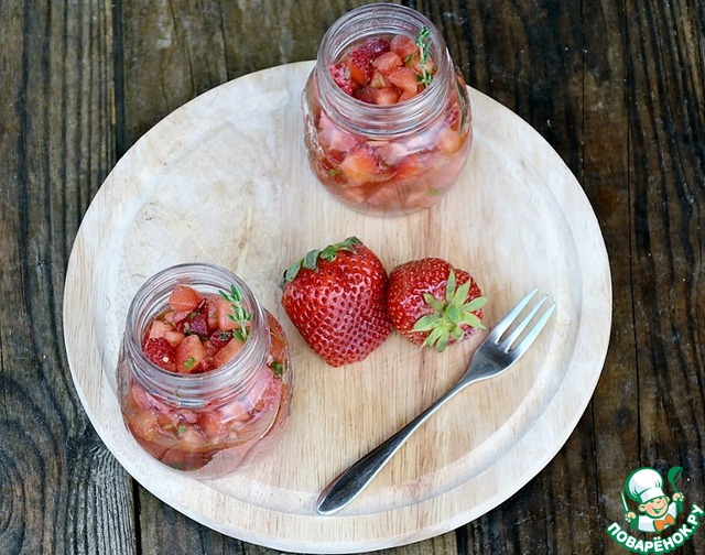 Смешать помидоры, клубнику и заправку, все тщательно перемешать и дать постоять в холодильнике минут 20-30.