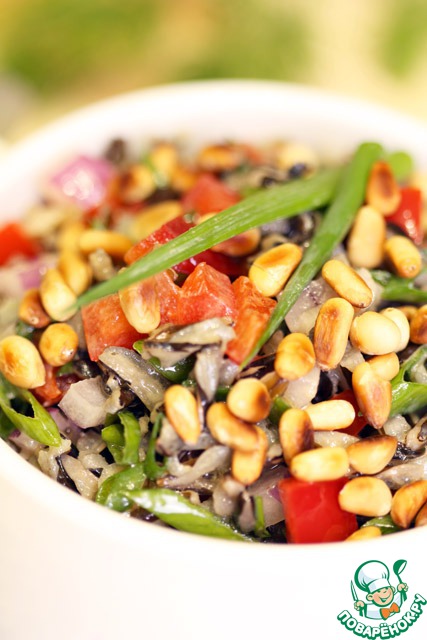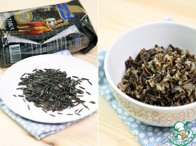 Для приготовления этого салата нам понадобится отварить рис. Лучше всего - дикий, но можно заменить смесью. Готовим, как указано на пачке и остужаем до комнатной температуры.