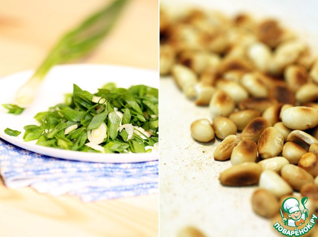 Далее мелко режем зеленый лук и обжариваем орехи на сухой сковороде.