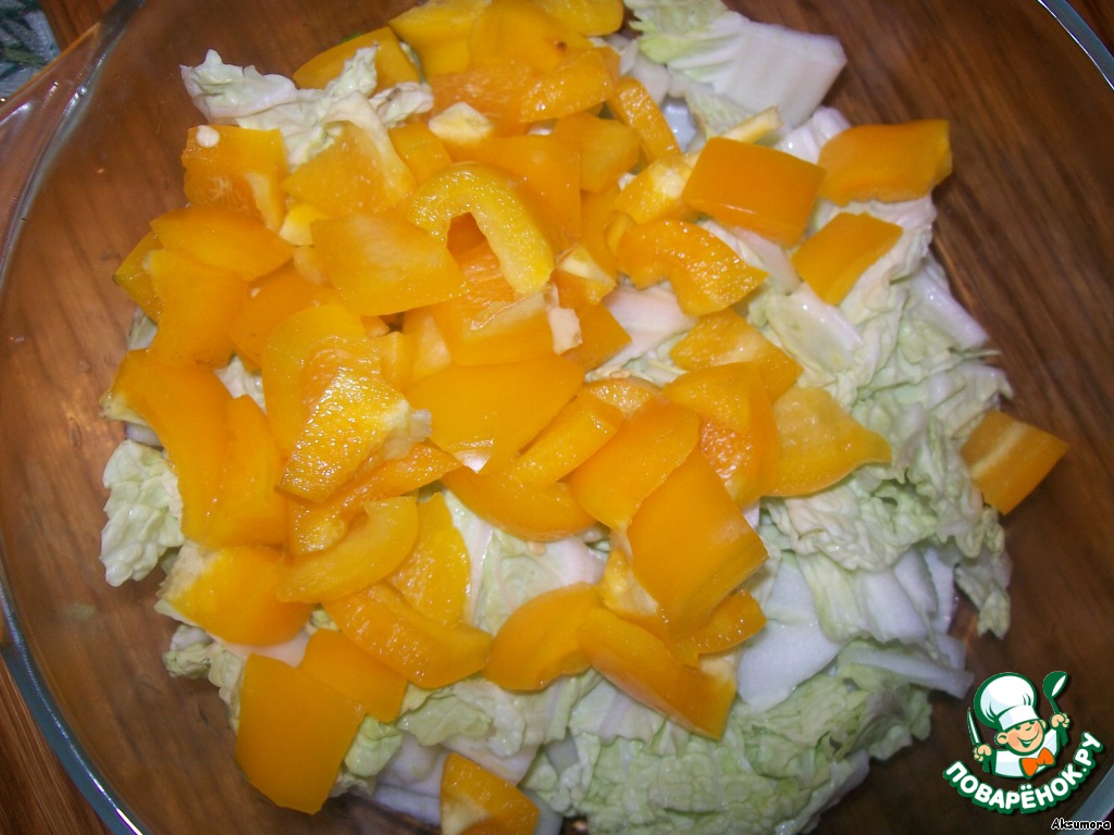 3-4 листа пекинской капусты и перец, очищенный от семян, крупно нарезать и выложить на дно салатника.