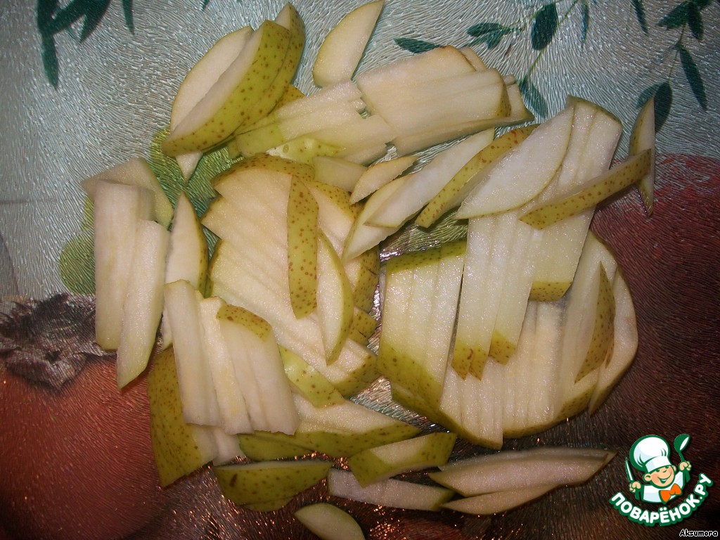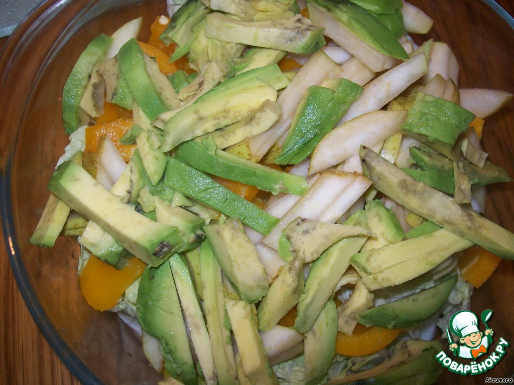 Авокадо очистить, освободить от косточки и нарезать, как грушу, тонкими ломтиками. Выложить всё в салатник.