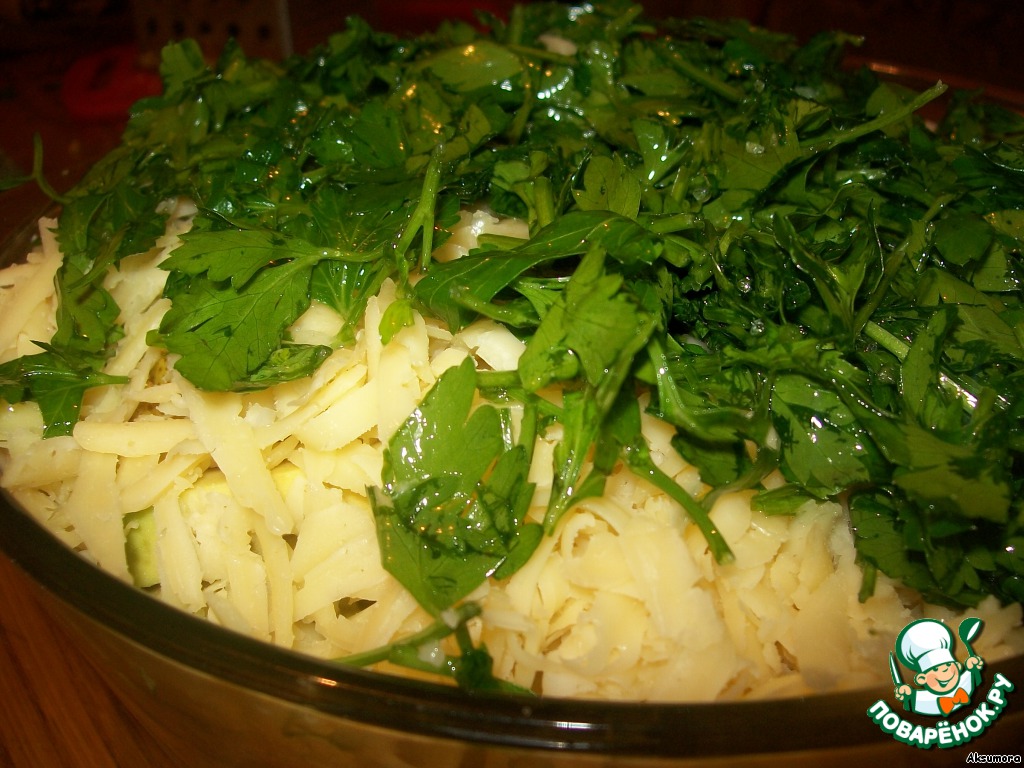Внимание! Можно все овощи оставить слоями или перемешать! Сверху на салат - натертый на крупной терке сыр. Готовый салат полить заправкой с петрушкой.