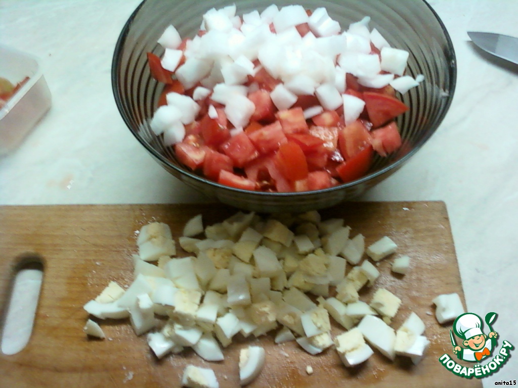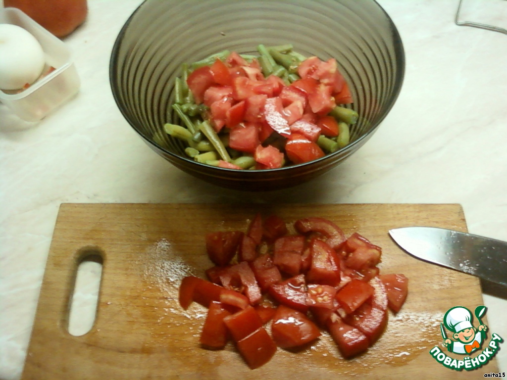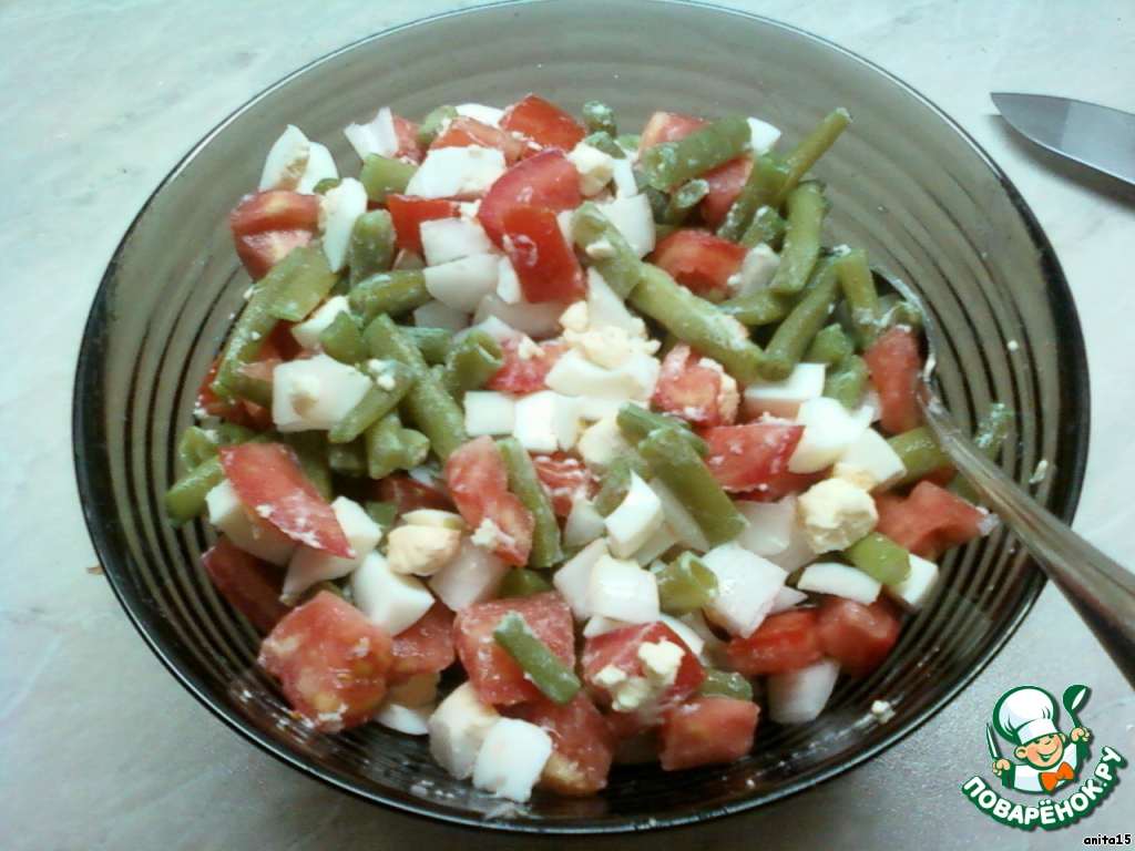 1. Фасоль если свежая, то промыть, порезать на части, отварить. Если фасоль замороженная, то просто отварить. Соответственно на фото готовые ингредиенты для салата. На самом деле, я всегда делаю его "на глаз". По объемам, фасоли и помидор должно быть примерно одинаково, а яиц чуть больше лука.