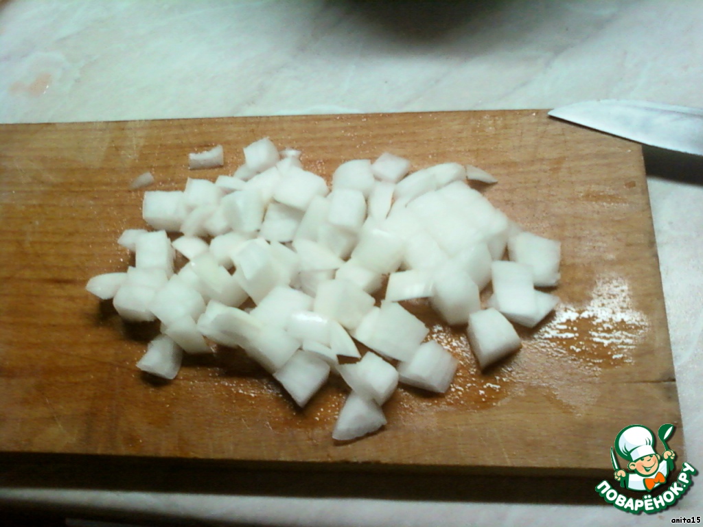 3. Лук (у меня салатный белый - для красоты) нарезаем тоже кубиком. Главное - не мельчим!