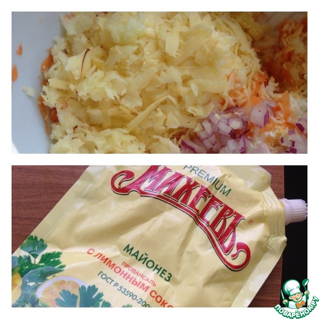 Морковь помыть, очистить и натереть на средней терке. Отварные яйца также натереть. Добавить в салатник мелко нашинкованный лук, и сыр натертый на средней терке