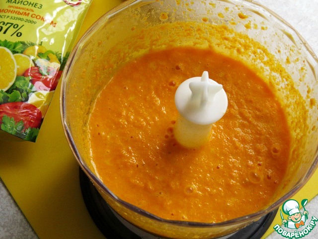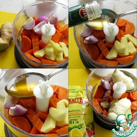Нарезаем небольшими кусочками морковь, лук, корень имбиря и загружаем в чашу блендера. Добавляем бальзамик, мёд, майонез, соль, смесь перцев и измельчаем до однородной консистенции. Если соус получился густоватый, добавьте пару ст. ложек овощного бульона или просто воды.