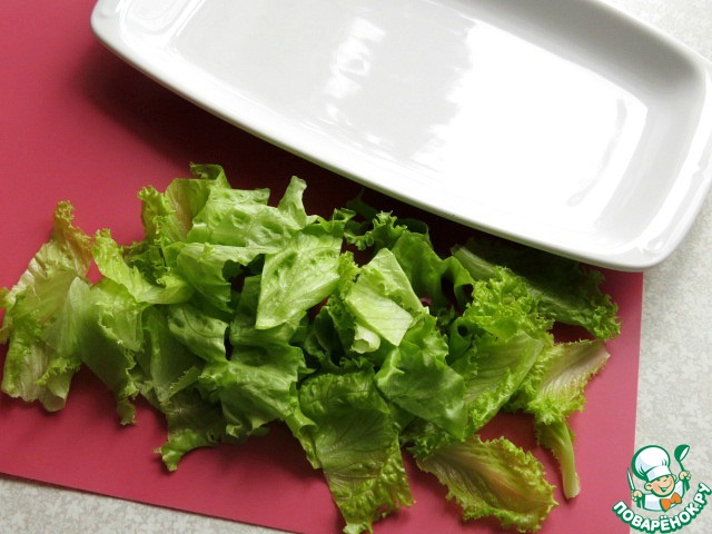 Затем листья салата моем, даём стечь воде, рвём или режем произвольно и выкладываем на блюдо.