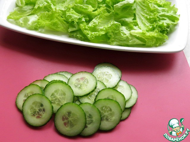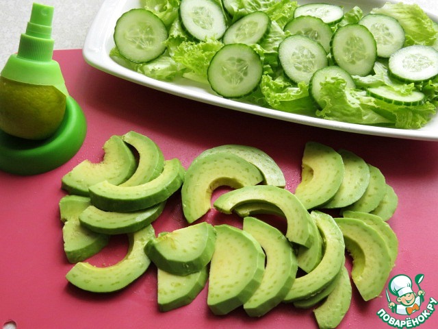 Авокадо чистим, удаляем косточку, нарезаем ломтиками и сбрызгиваем лимонным соком, чтобы авокадо не потемнел. Выкладываем его сверху листьев салата и огурцов.