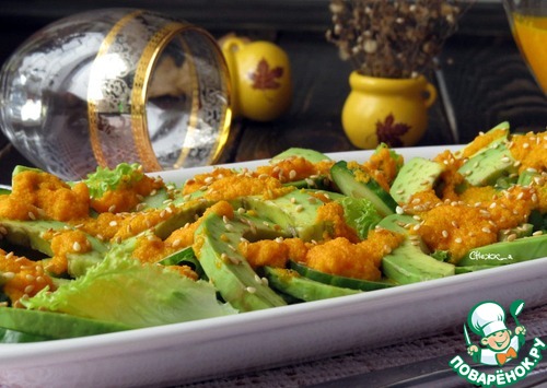 | Салат из огурца с авокадо под соусом из моркови и имбиря. Сочетание спелого авокадо с хрустящими листьями салата, освежающим вкусом огурца под ярким, пикантным соусом из моркови и имбиря просто великолепно! Яркий, эффектный салат достоин праздничного стола, а ваши гости по достоинству оценят этот необычный салат. Пробуйте и наслаждайтесь! |