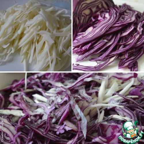 Оба вида капусты нашинковать. Добавить щепотку соли.