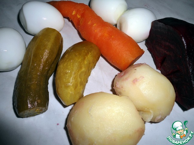 Яйца, картофель, морковь, свеклу отварить, почистить. Всё натереть на мелкой терке.