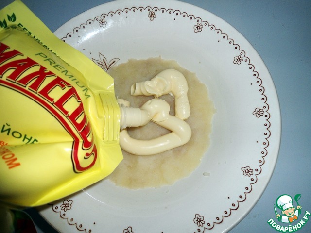 Укладываем в блюдо слой картофеля, утрамбовываем, смазываем майонезом.
