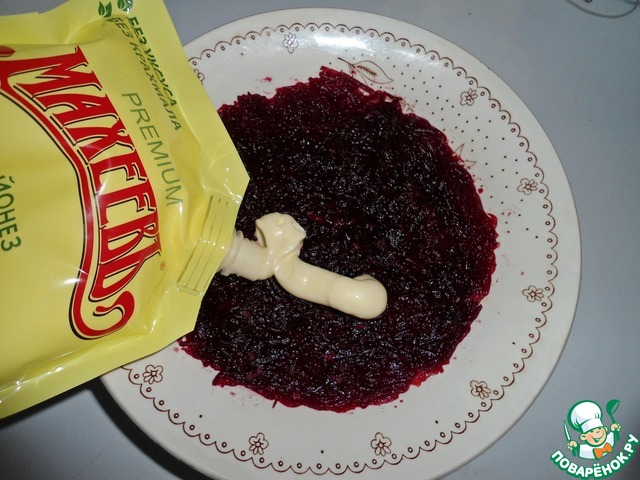 Наверх - тертые яйца. Для украшения я подготовила "краску" двух цветов - розовую (с соком свеклы) и желтую (с соком моркови), смешанные с майонезом.