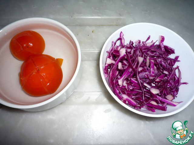 Нарезать соломкой капусту, смешать с уксусом (у меня винный), оставить на минут 10. Помидоры залить на несколько минут горячей водой.