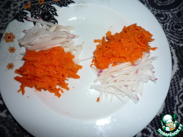 Редис тоже нарезаем соломкой. Морковь натираем на крупной терке. Укладываем в тарелку (салатницу) небольшими кучками.