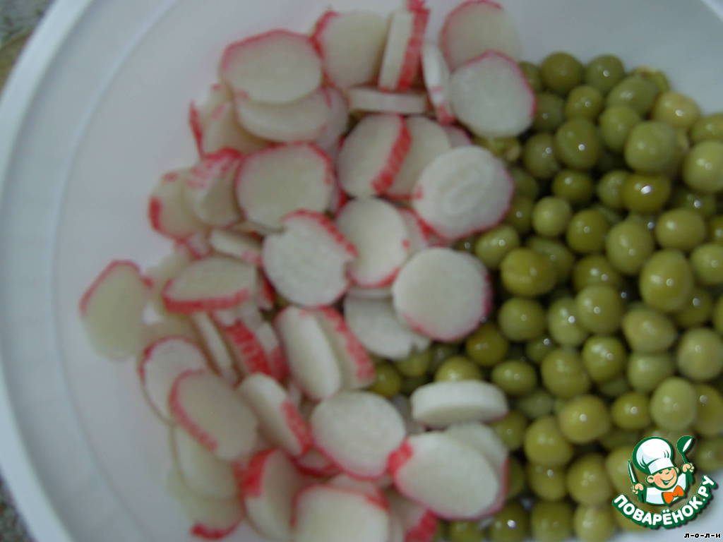 Нарезать крабовые палочки кольцами, приготовить горошек.