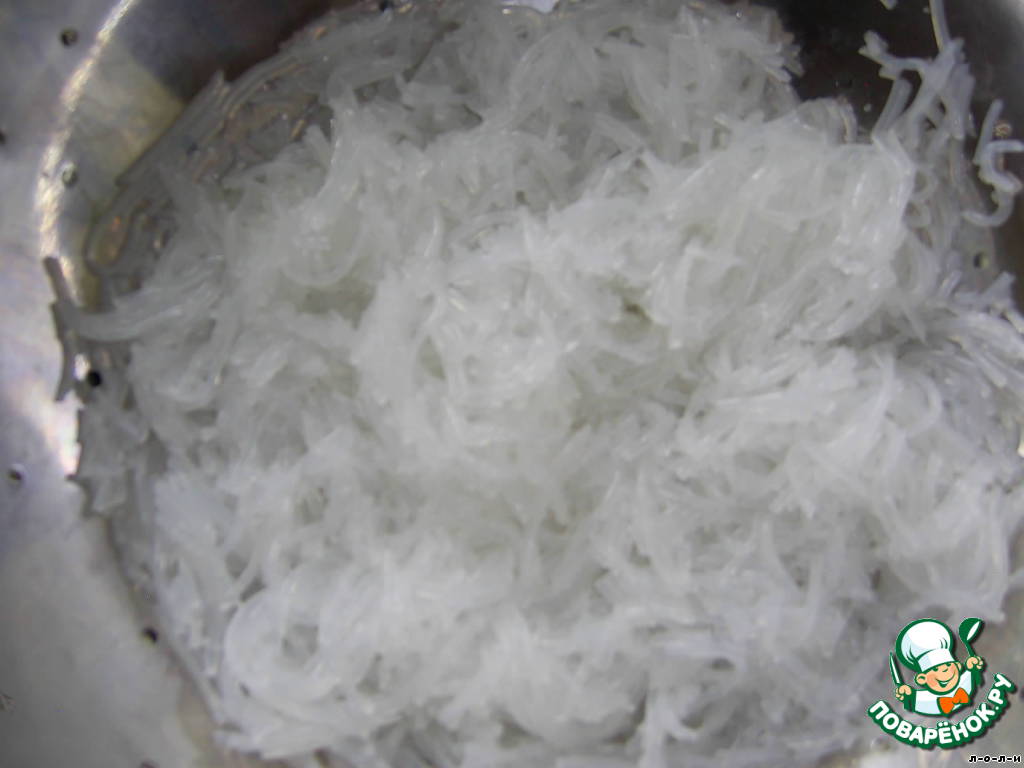 Перемешать горошек, крабовые палочки, фунчезу. Заправить салат острым соевым соусом и горчичным майонезом. Получается вот такое вот блюдо.