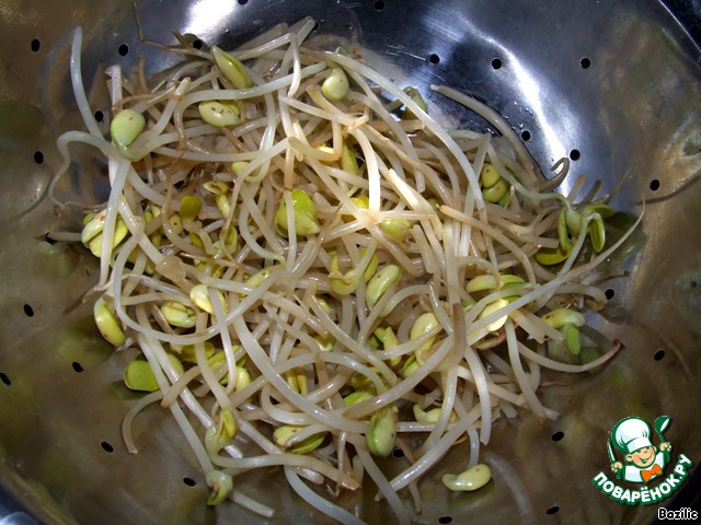 2. В кипящую воду кладем ростки сои и варим 5 мин., затем остужаем.